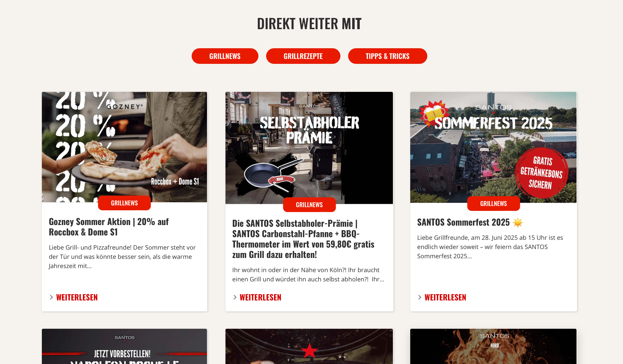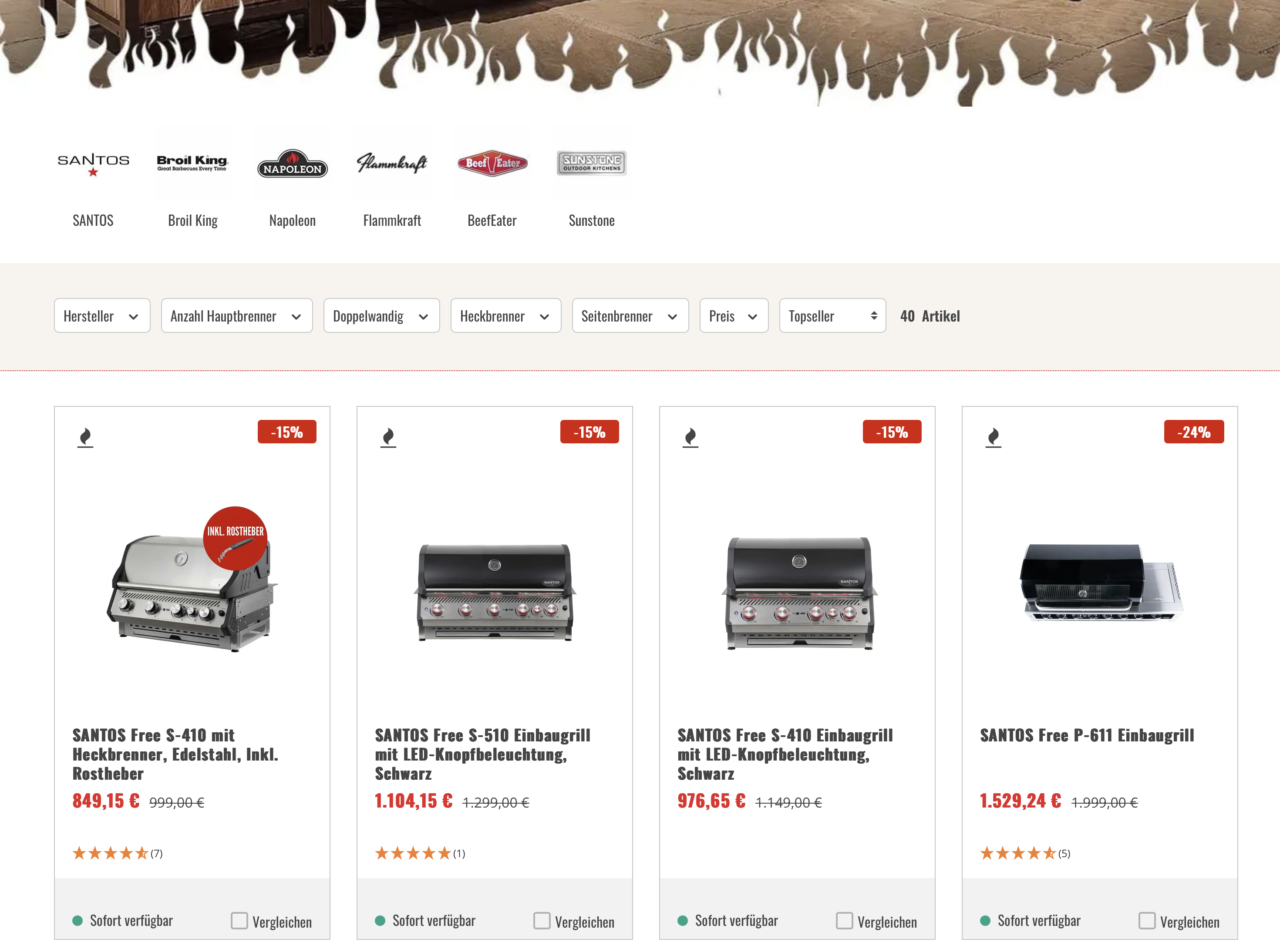 Santos Grills, gegründet 2005, ist einer der weltweit größten Grillfachhändler. Im Kölner Showroom gibt es über 400 Grillgeräte und 3.000 Zubehörartikel. Santos bietet eine eigene Grillmarke, zahlreiche Grillseminare, und umfassende Dienstleistungen wie Beratung, Lieferung, Aufbau und Reparatur. Der Onlineshop versendet schnell europaweit und bietet erstklassigen Kundenservice.